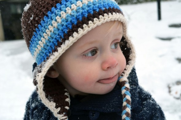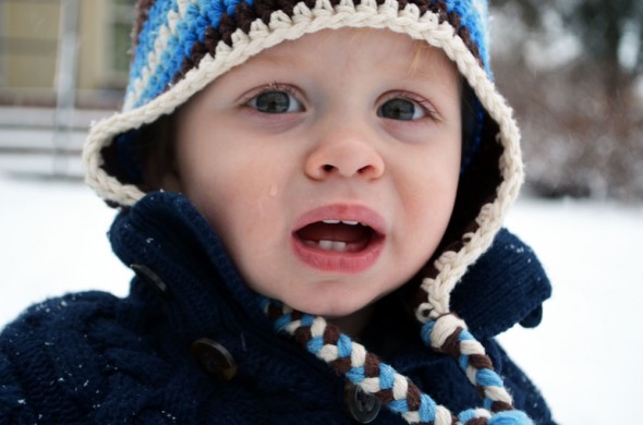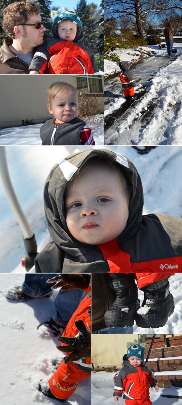 We finally got some winter snow, about five inches that the Peanut could really care less about. He loves going outside (mainly so he can get closer to watching cars), but he did not enjoy a) his new snow boots, b) his snow suit coat and c) our suggestions that he “walk” in the snow. He went down on his butt a couple of times, but it was when he fell hands first and got snow inside his coat that he decided it was bullshit.