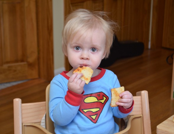 He tried pizza this weekend. Only a couple of bites, but we don’t sneer at progress.
