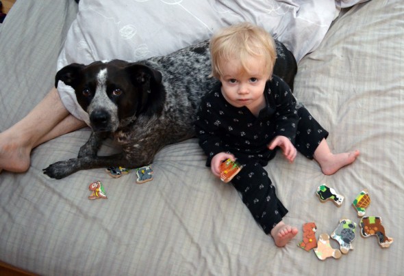 One of the Peanut’s favorite things to do is play on our bed. Especially in the morning when one of us is trying to sleep… the Porkchop is much better about keeping him out of the bedroom when it’s my turn to sleep in (he just loves his Daddy so much, I can’t keep him out!). He loves to stack his toys up there, sitting snuggled next to the dog, sorting puzzle pieces or blocks into separate piles.